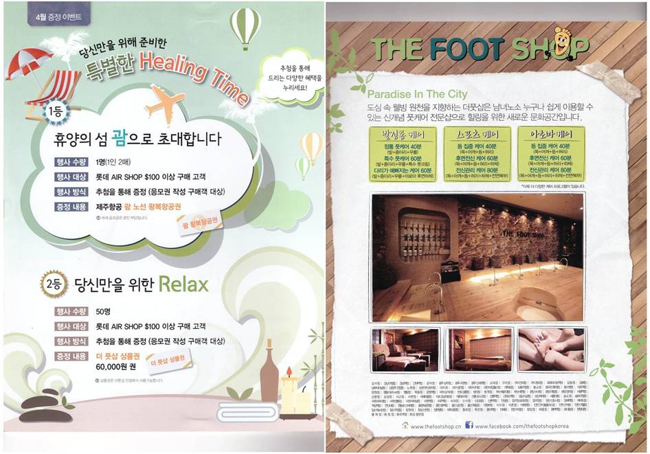 “더 풋샵”(www.thefootshop.cn)은 남녀노소 누구나 쉽게 이용할 수 있는 신개념 풋 케어 전문샵으로 도심 속 웰빙 원천을 지향하고 힐링을 위한 새로운 문화공간으로 자리매김하고 있으며, 4월 제주항공과 “더 풋샵”은 특별한 이밴트를 진행하고 있다.