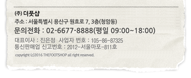㈜더풋샵│대표이사 : 진은정│사업자 번호 : 105-86-87325│통신판매업 신고번호 : 2012-서울마포-811호│주소 : 서울특별시 마포구 상암동 DMC 이안오피스동 15층│고객문의 : 02-6677-8888(평일 09:00~18:00) │COPYLIGHTⓒ2014 THE FOOT SHOP All right reserved.